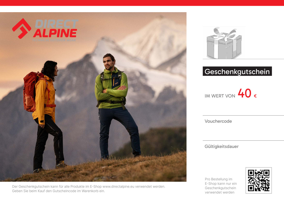 Sie sind sich bei der Wahl Ihrer Kleidung, Ihrer Lieblingsfarbe oder -größe nicht sicher? Möchten Sie Ihren Lieben oder Freunden eine Freude machen, indem Sie ein Original-Funktionskleidungsstück von Direct Alpine kaufen? Wählen Sie einen Gutschein über den gewählten Betrag aus und überlassen Sie die Auswahl dem Beschenkten...